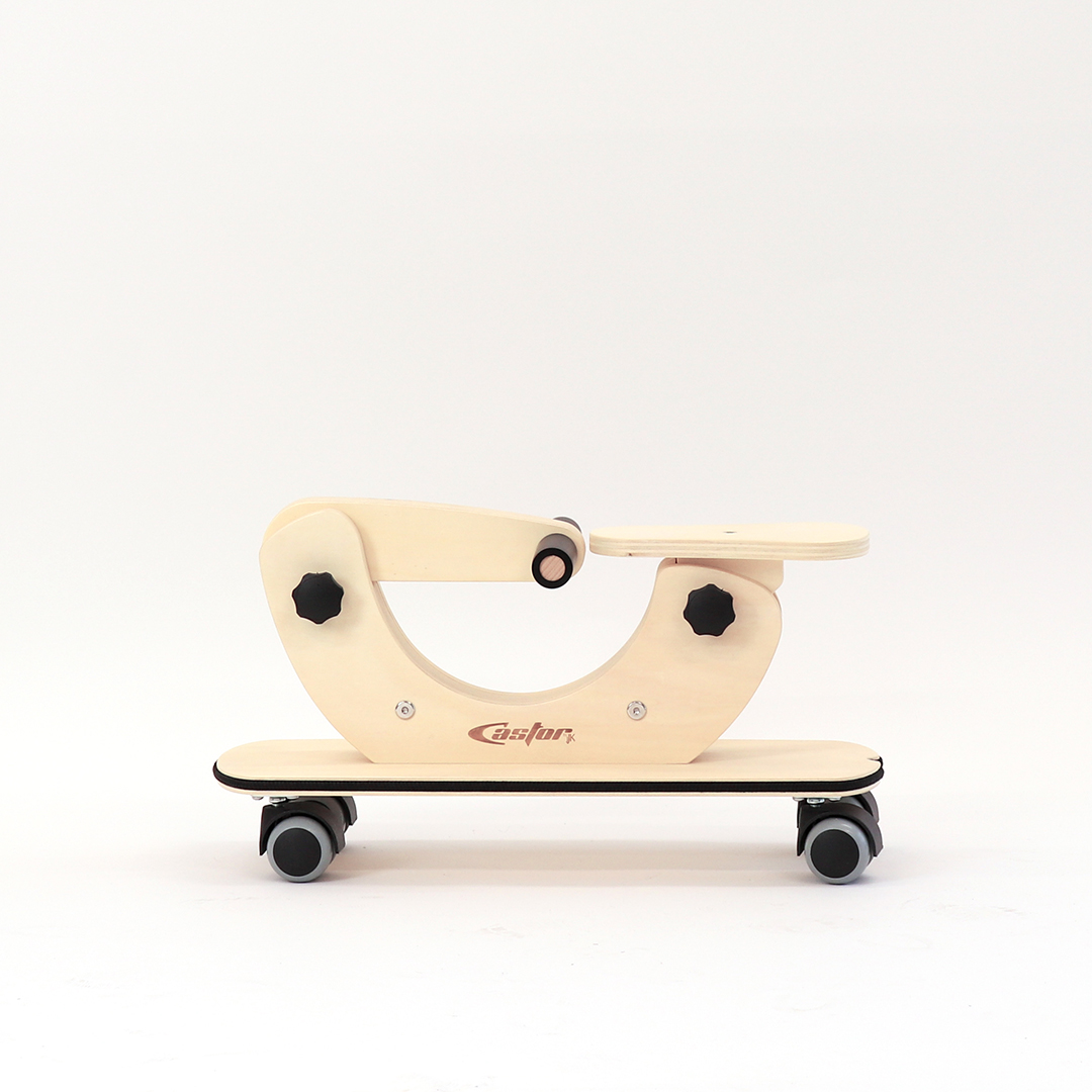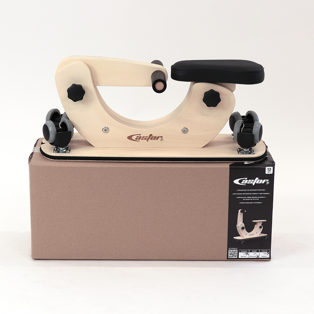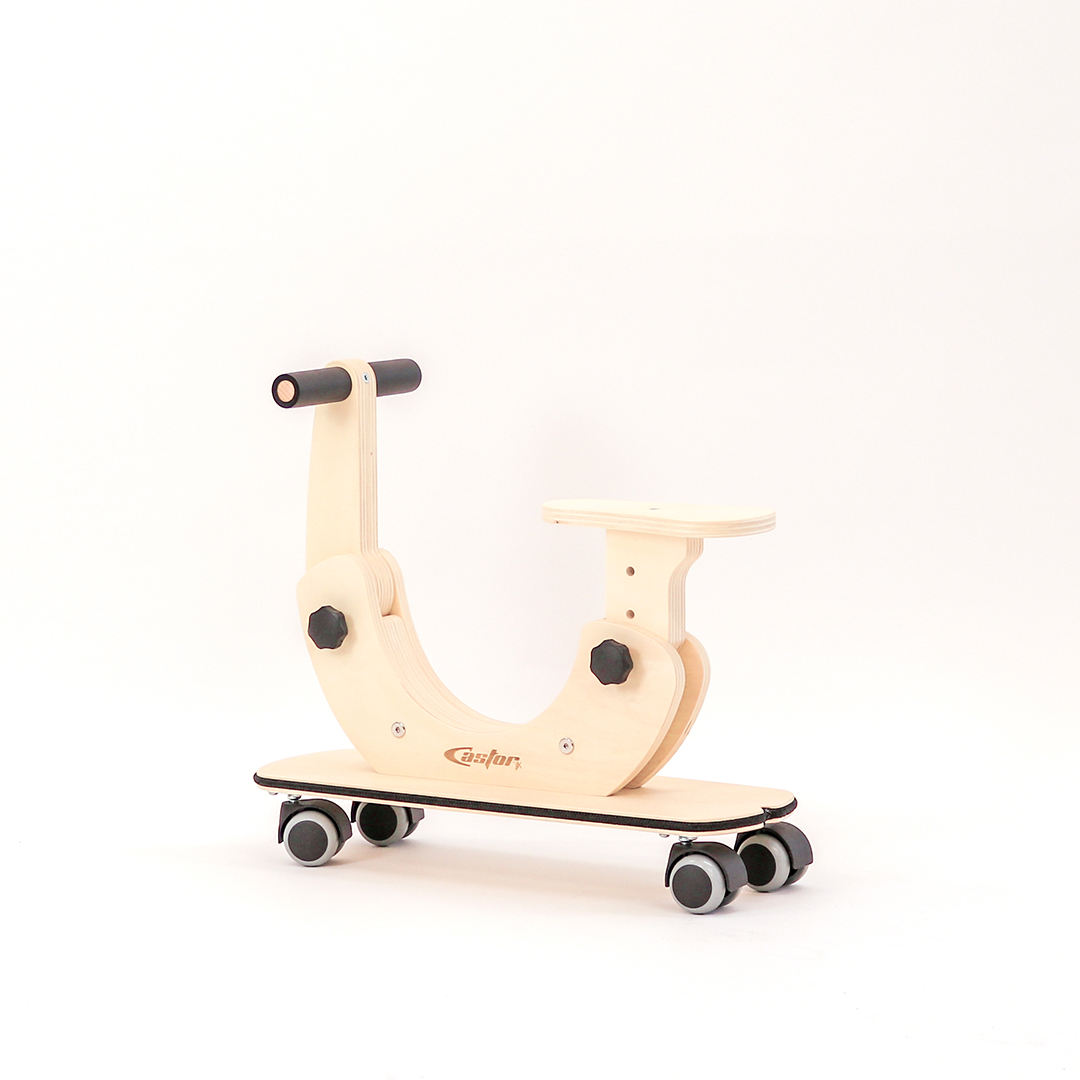 Poganjalec Castor je namenjen otrokom od enega do petega leta starosti in je primeren za notranje prostore ter gladke površine. Ključna lastnost Castorja so za 360 stopinj vrtljiva kolesa, ki zagotavljajo odzivno premikanje v vse smeri, zaradi česar se okretno izogiba pohištvu in drugim oviram ter hitro najde pot iz tesnih prostorov in slepih ulic. Nastavitve sedeža in krmila omogočajo, da poganjalec raste skupaj z otrokom. Podvozje v obliki rolke nudi prostor za stopala, okoli deske pa je napet tudi zaščitni odbijač. Spuščen okvir v sredini omogoča enostavno in varno sedanje in sestopanje.