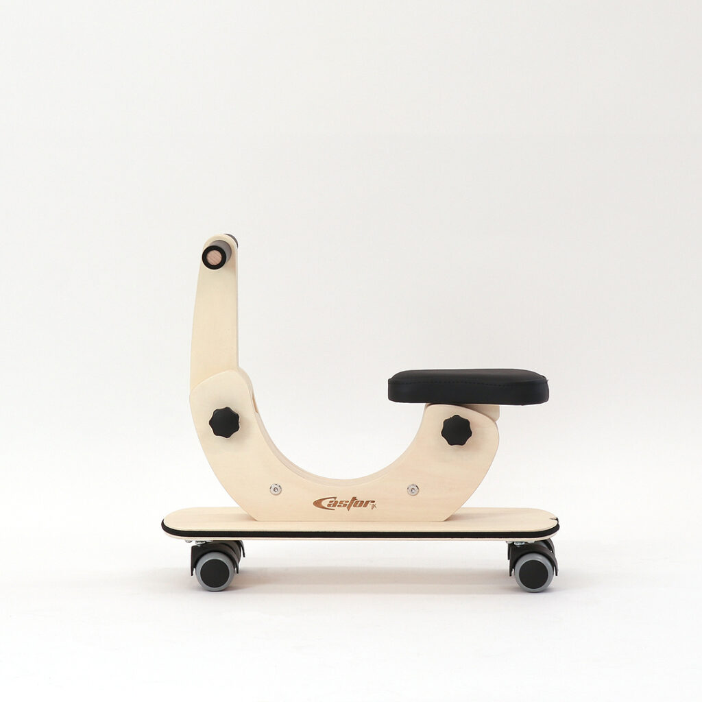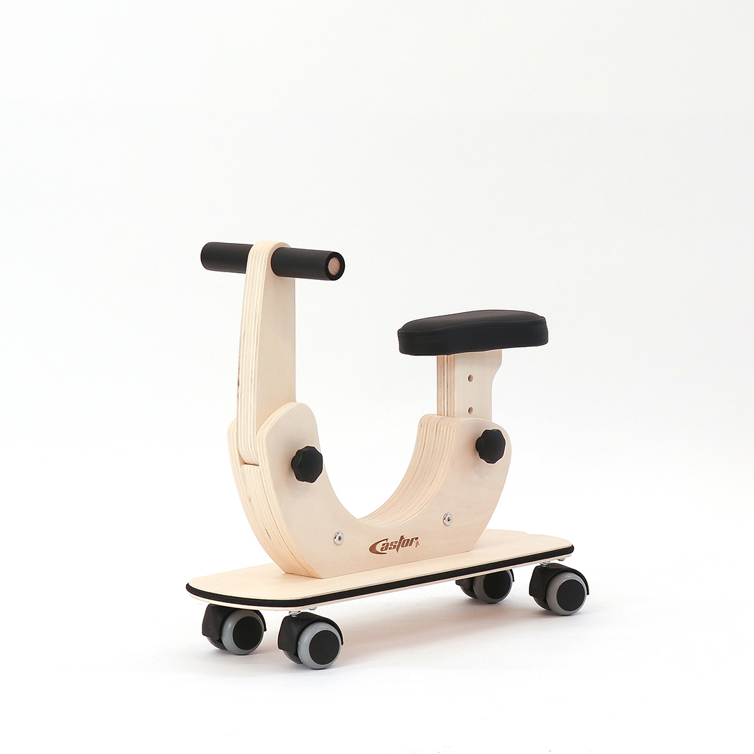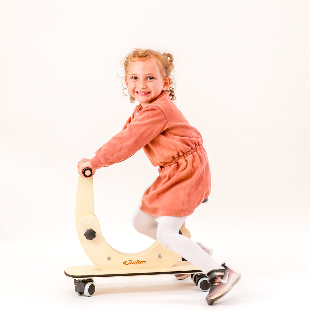 Poganjalec Castor je namenjen otrokom od enega do petega leta starosti in je primeren za notranje prostore ter gladke površine. Ključna lastnost Castorja so za 360 stopinj vrtljiva kolesa, ki zagotavljajo odzivno premikanje v vse smeri, zaradi česar se okretno izogiba pohištvu in drugim oviram ter hitro najde pot iz tesnih prostorov in slepih ulic. Nastavitve sedeža in krmila omogočajo, da poganjalec raste skupaj z otrokom. Podvozje v obliki rolke nudi prostor za stopala, okoli deske pa je napet tudi zaščitni odbijač. Spuščen okvir v sredini omogoča enostavno in varno sedanje in sestopanje.